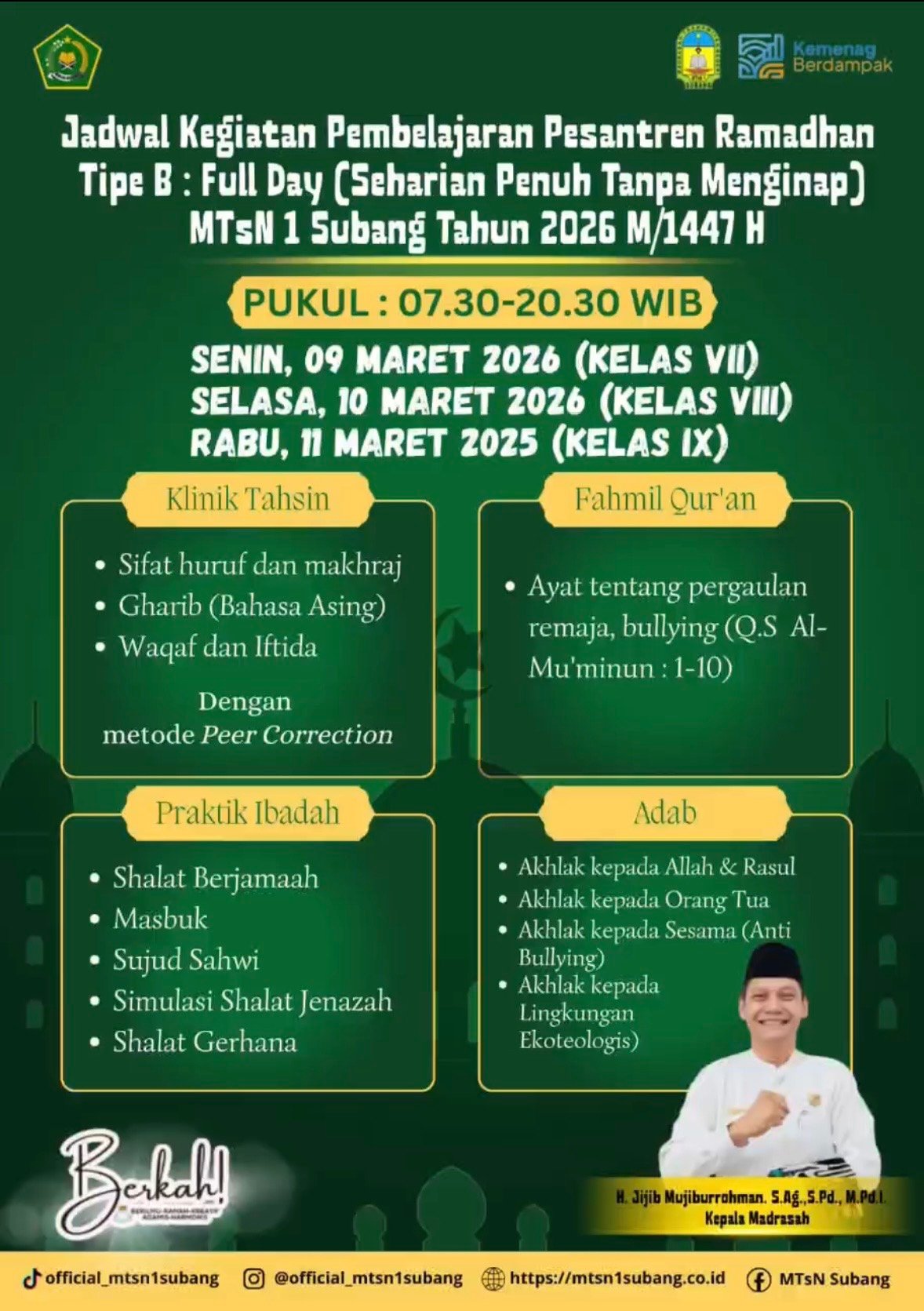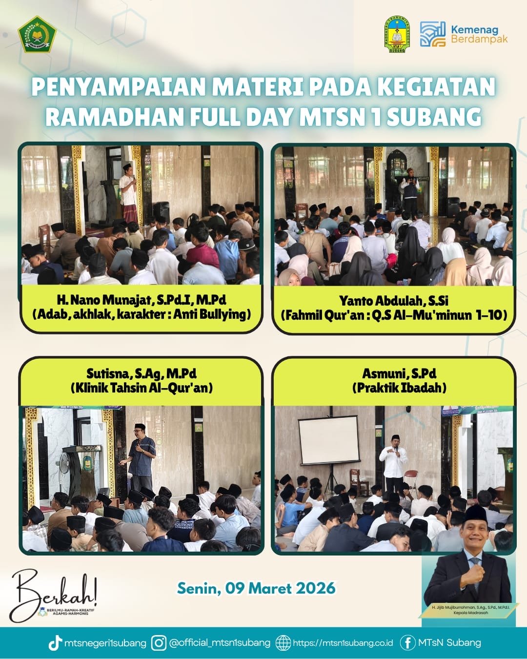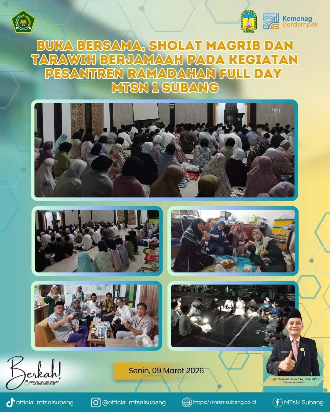 Subang – Memasuki bulan suci Ramadhan 1447 H, MTs Negeri 1 Subang menyelenggarakan kegiatan Pesantren Ramadhan Full Day mulai dari tanggal 9 Maret 2026 sampai dengan tanggal 11 Maret 2026 sebagai upaya memperkuat karakter dan spiritualitas siswa. Kegiatan yang berlangsung selama 3 hari ini diikuti dengan antusias oleh seluruh civitas akademika, mulai dari siswa, guru, hingga staf madrasah.