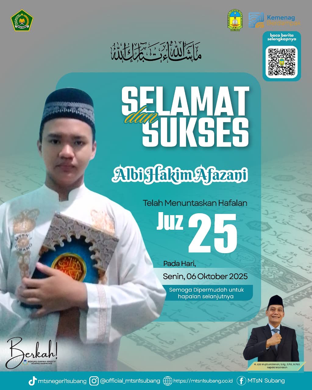JF MTSN1SUBANG – Subang, 06 Oktober 2025. Keluarga besar MTsN 1 Subang kembali diselimuti rasa syukur dan bangga. Salah satu siswa berprestasi di bidang tahfidz Al-Qur'an, Albi Hakim Afazani, berhasil menuntaskan hafalan Juz 25 pada hari Senin, 06 Oktober 2025.