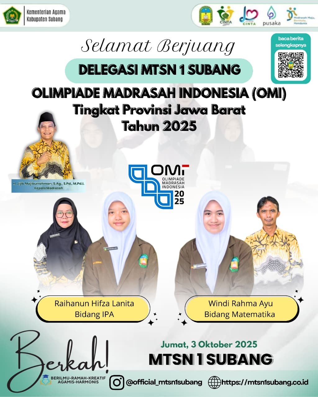 JF MTSN1SUBANG – Subang, 3 Oktober 2025. Hari ini, Jumat, 3 Oktober 2025 MTsN 1 Subang mengirimkan delegasi terbaiknya untuk mengikuti ajang bergengsi Olimpiade Madrasah Indonesia (OMI) Tingkat Provinsi Jawa Barat Tahun 2025. Dua siswi MTsN 1 Subang, Windi Rahma Ayu dan Raihanun Hifza Lanita siap bertanding membawa nama baik madrasah dan Kabupaten Subang. Windi siap berkompetisi pada bidang Matematika, sedangkan Raihanun pada bidang IPA. Keberangkatan delegasi ini disambut dengan penuh semangat dan dukungan dari seluruh keluarga besar MTsN 1 Subang.