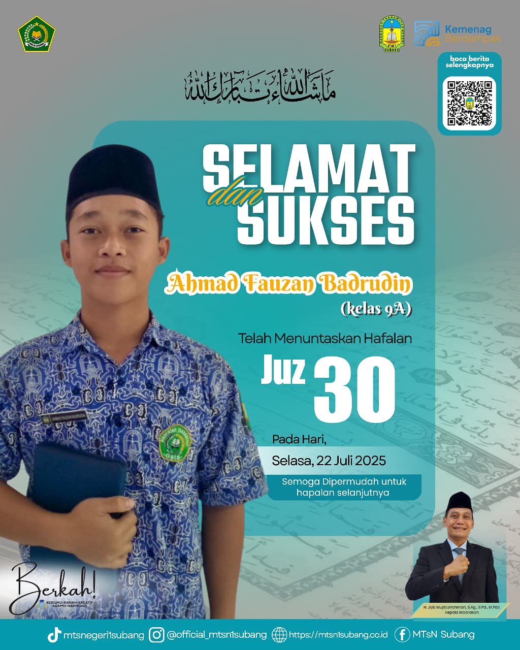 "Kami mengucapkan Selamat dan Sukses kepada ananda Ahmad Fauzan Badrudin atas capaiannya menghafal Juz 30. Ini adalah anugerah dan kebanggaan bagi MTsN 1 Subang," ujar Kepala MTsN 1 Subang, H. Jijib Mujiburrohman, S.Ag., S.Pd., M.Pd.I., yang turut memberikan apresiasi tinggi. Juz 30 atau Juz 'Amma merupakan bagian terakhir dari Al-Qur'an yang sering menjadi fokus awal bagi para penghafal. Menuntaskan hafalan ini adalah langkah awal yang sangat penting dalam perjalanan menjadi seorang hafiz/hafizah.