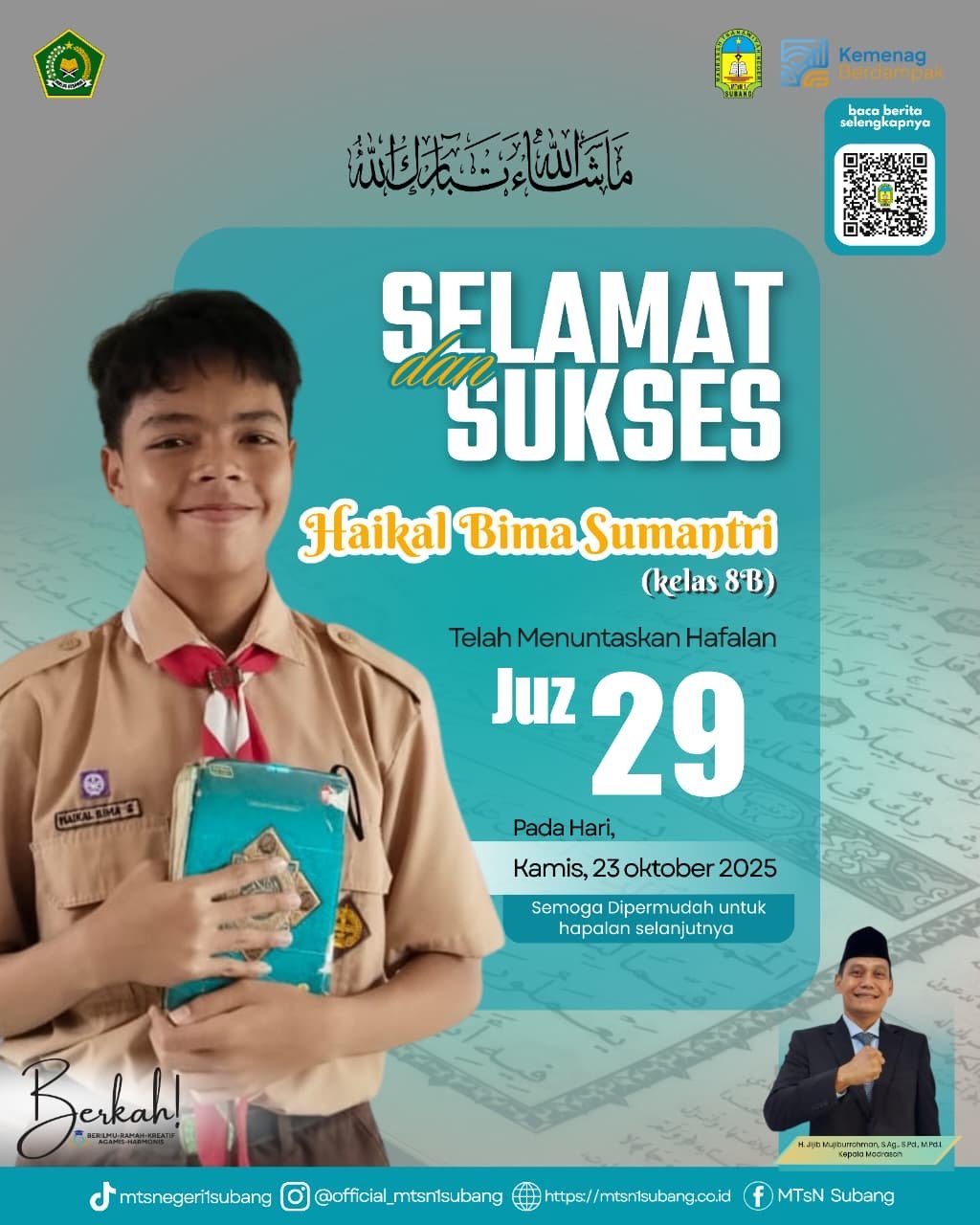 Selamat dan sukses untuk ananda Haikal Bima Sumantri, siswa kelas 8B, yang telah menuntaskan hafalan Juz 29 pada hari Kamis, 23 Oktober 2025. Semoga pencapaian ini menjadi berkah dan mempermudah Haikal untuk hafalan selanjutnya.