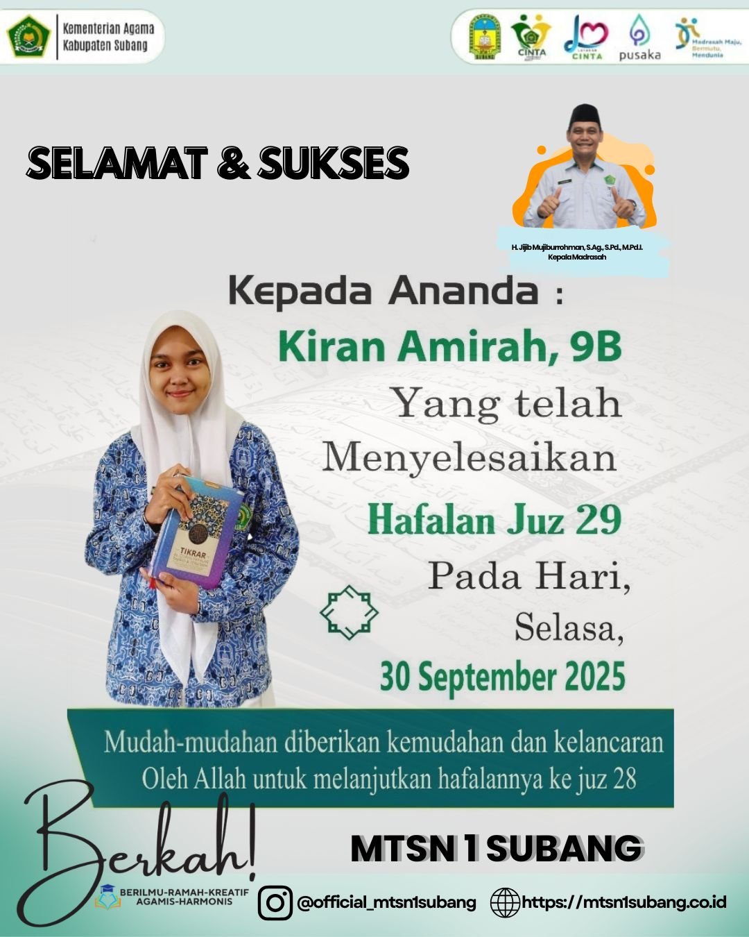 Keberhasilan Kiran Amirah menuntaskan hafalan Juz 29 menjadi bukti nyata komitmen MTs Negeri 1 Subang dalam mencetak generasi Huffazh (penghafal Al-Qur'an) yang berprestasi.