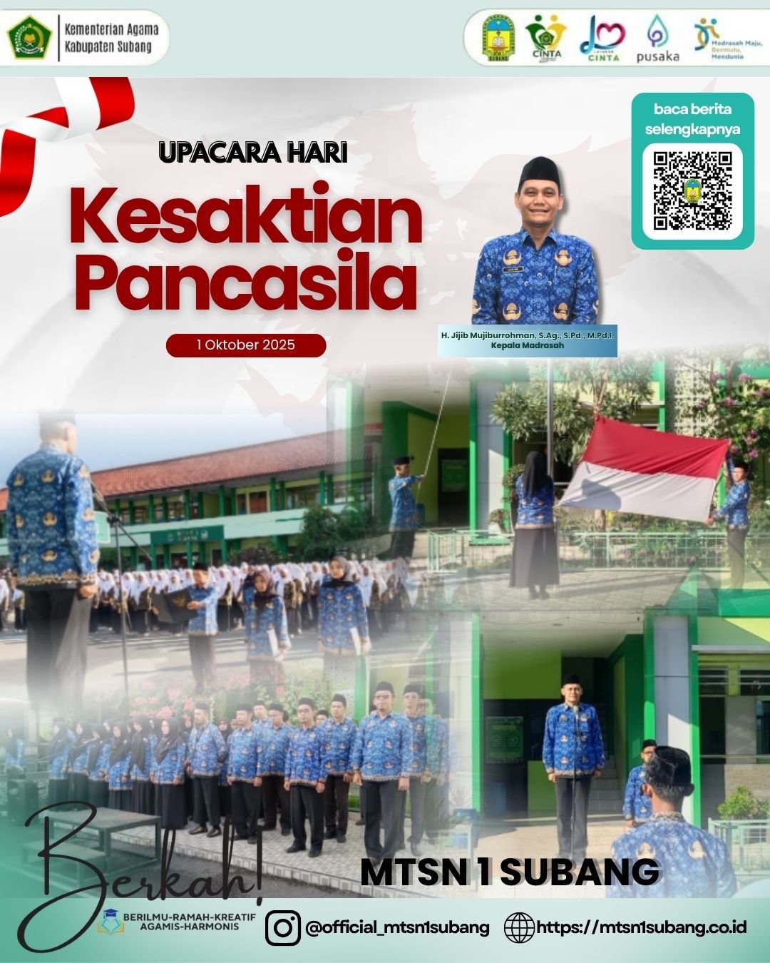 Hari Kesaktian Pancasila adalah momentum refleksi bagi kita semua. Sebagai satuan pendidikan di bawah Kementerian Agama, kita wajib menanamkan nilai Ketuhanan Yang Maha Esa, Kemanusiaan, Persatuan, Kerakyatan, dan Keadilan Sosial sejalan dengan semangat madrasah kita: Berilmu-Ramah-Kreatif, Agamis-Harmonis.