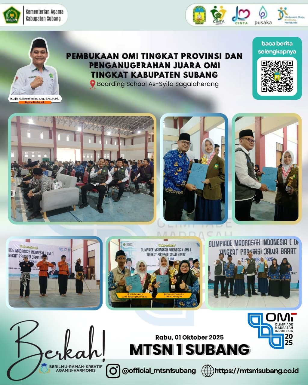 JF MTSN1SUBANG – Subang, 1 Oktober 2025. Delegasi MTsN 1 Subang menghadiri acara prestisius berupa Pembukaan Olimpiade Madrasah Indonesia (OMI) Tingkat Provinsi Jawa Barat sekaligus Penganugerahan Juara OMI Tingkat Kabupaten Subang. Acara ini diselenggarakan dengan meriah di lingkungan Boarding School As-Syifa Sagalaherang pada hari Rabu, 1 Oktober 2025.